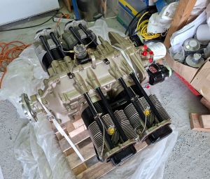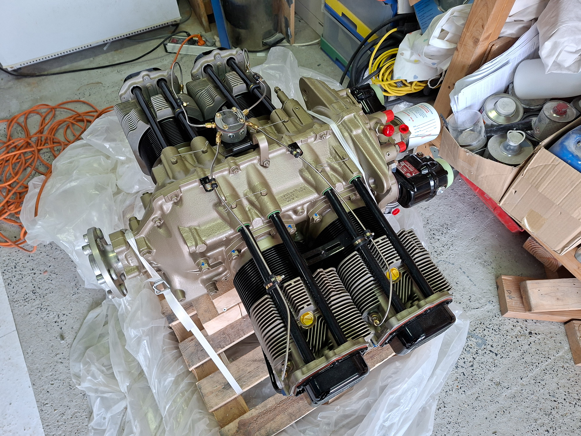 First step was to remove the safety straps that held the engine to the wood pallet that was used for transport. I want to keep track of how this was done as this engine is a brand new engine that has not yet been on the test bench. When all is ready, I will need to unhook the engine and bring it to PMM Wingservice to have it running on the test bench for a first time. This has the disadvantage of extra work on removing the engine and all connections again and having to do it again after it has been run. On the other hand, the major advantage is that I do not have to worry about corrosion and idle time of the engine as it has not yet been running. The cylinders are as if they would be in a stock location on a bench waiting for an engine. There has been no movement of the cylinder heads on the cylinder walls and everything has an oil film on it as delivered from Superior Air Parts. Whether building takes me another 3 years or just 1, it won't matter. I'm gladly willing to take that extra work knowing there is no pressure.