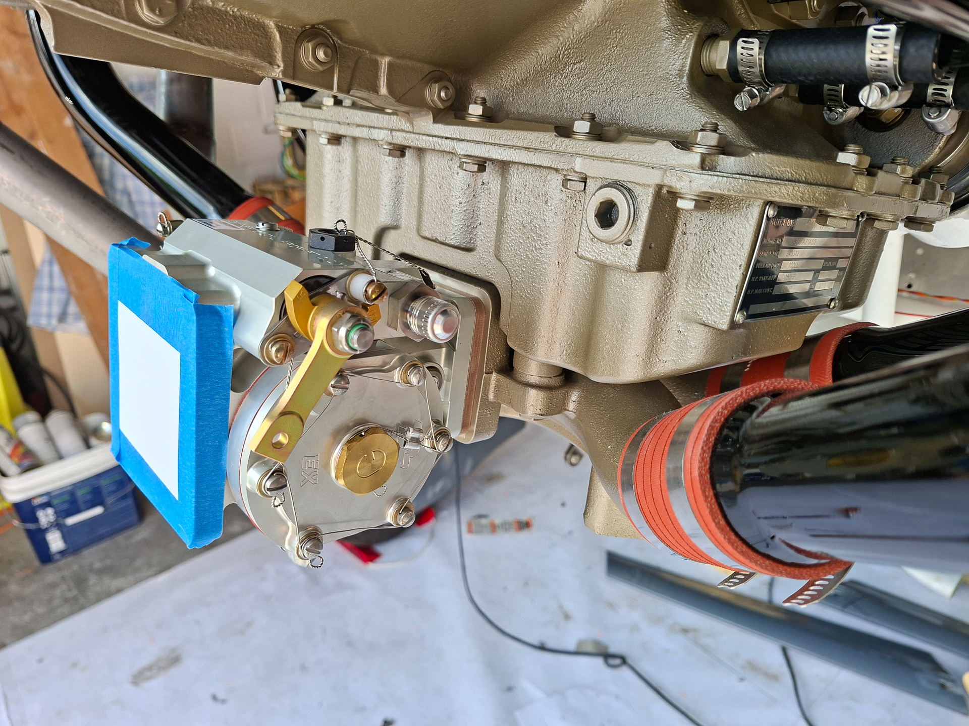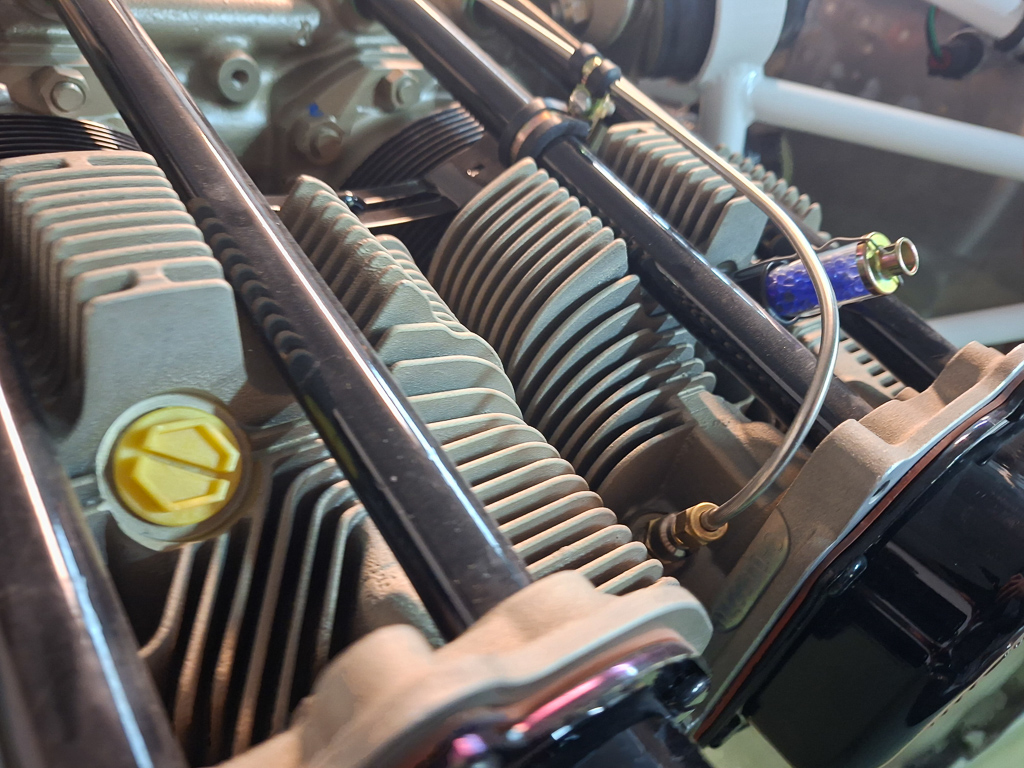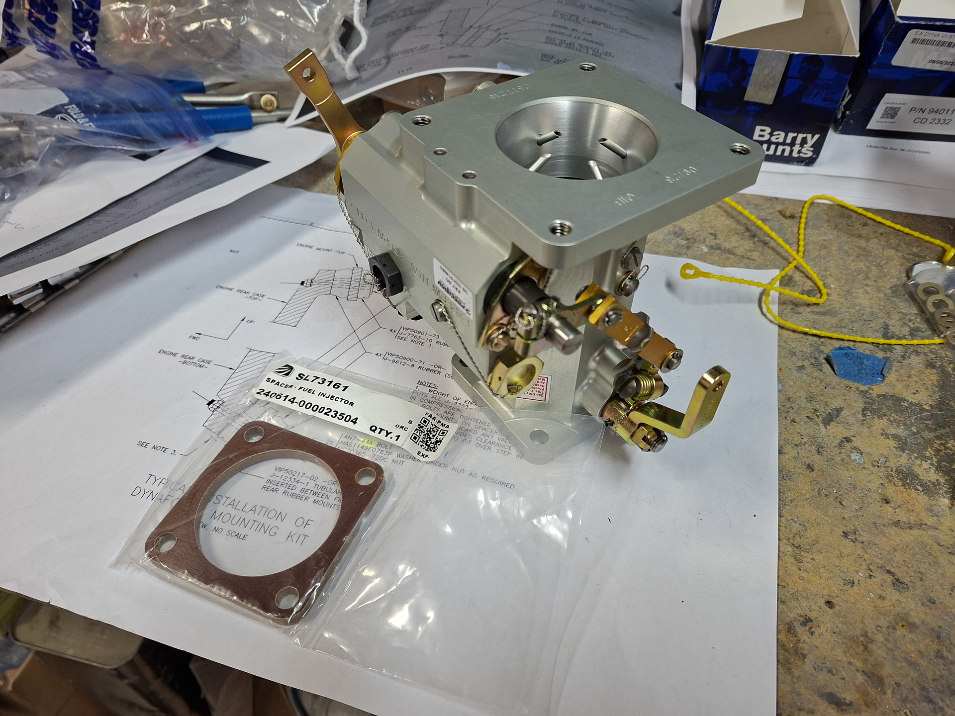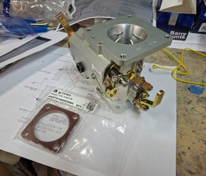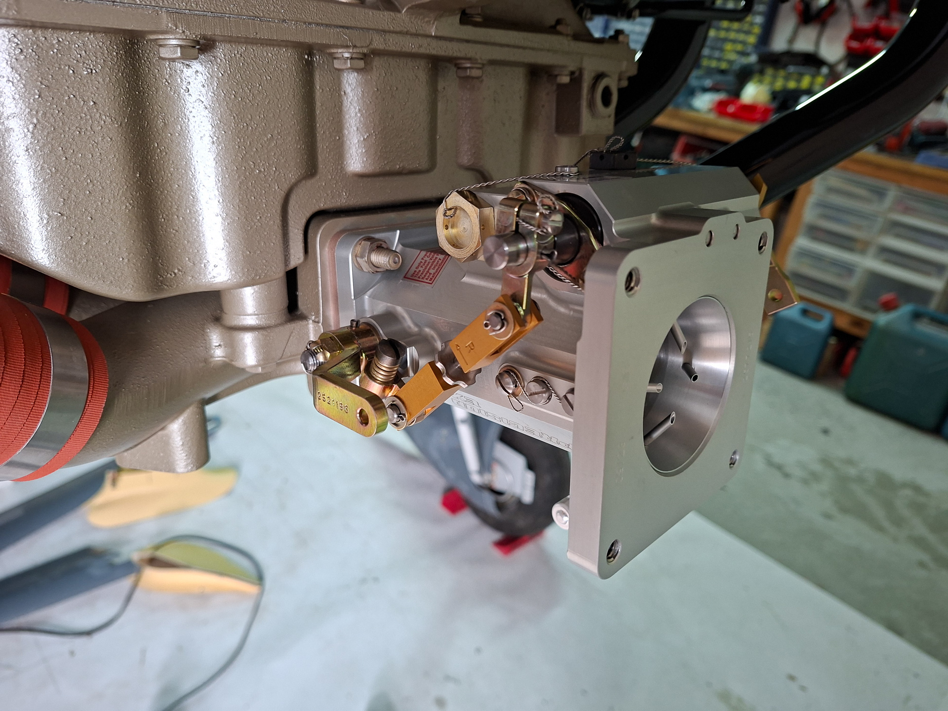 The orientation of the throttle body was a bit of a mystery at first but soon figured out what side was the throttle lever and which side the mixture. In the image below I installed it on the forward horizontal induction air intake at the cold sump of the engine. In the image below, the throttle lever is the gold colored arm.