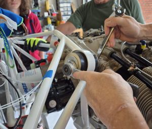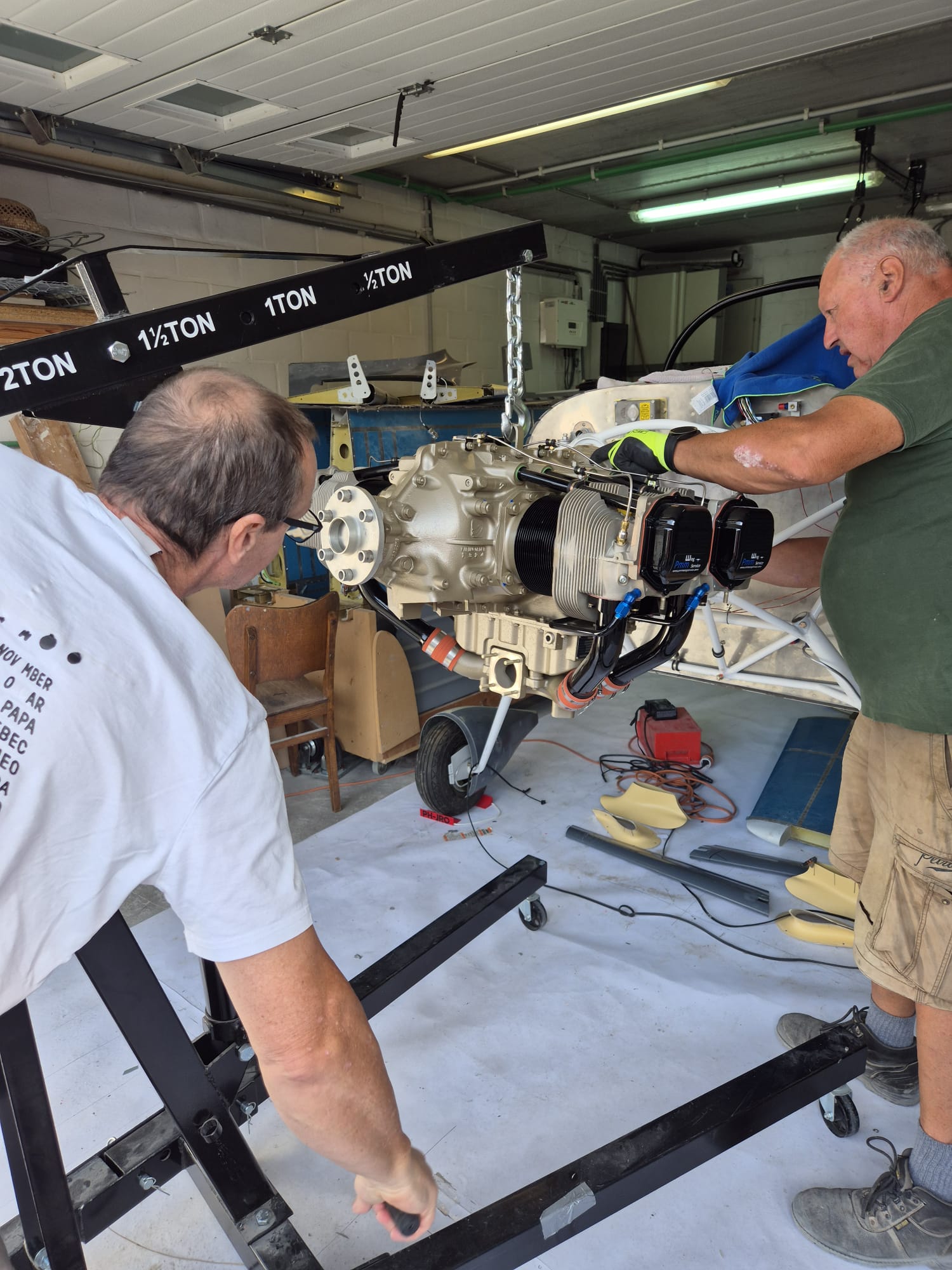 The last part of the moving is the most critical as you don't want your magneto's or fuel pump to bump into the engine mount. Having one person moving and another one guiding the engine is no luxury.