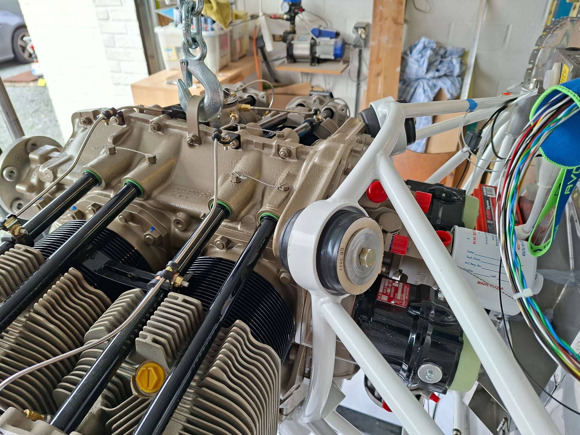 Milestone day ! This is one of those days that you know mark the timeline of building your airplane. The moment you hang the engine in the engine mount. After many days of thinking about missing any things on the firewall, I came to the conclusion that this is the right moment to hang the engine and move on to the firewall forward work. There are some more things I need to do on the firewall, but it's not possible to be sure about the exact location to drill large holes in the firewall until I can actually evaluate the position with the engine in place. i'm thinking of the mixture and throttle cable and alternate air cable. Other than those, I'm pretty sure everything on the firewall is in place.
