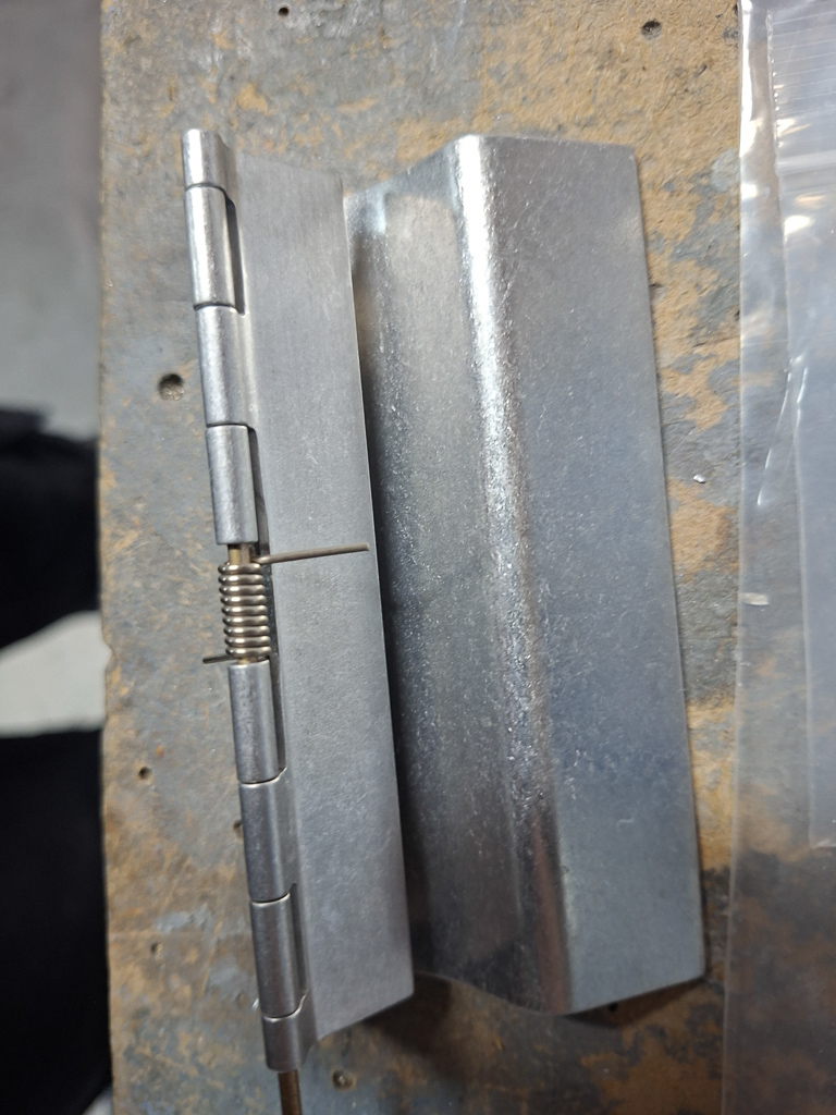 To secure the hinge pin, I have installed a small piece of angle with a hole in the center bottom, The pin just fits through. I installed a nutplate above it which holds a #6 screw to hold a little "door" that closes of the opening in the angle. When the door is open, the hinge tilts back and I can use a phillips screw driver to open the "door" and pull out the hinge pin. If ever I need to replace the spring in the hinge, that will be easy to do.