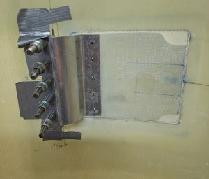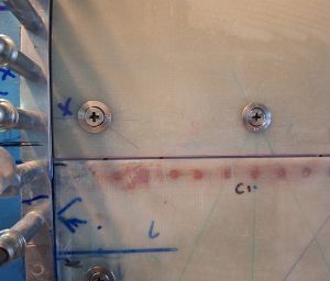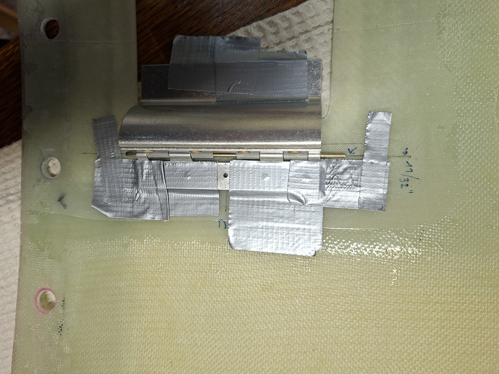 Next shot has the door drilled to the hinge flange through the epoxy doubler. Finally today, I will epoxy the doubler to the door by roughning the surface with 80grit sandpaper and making some epoxy paste as glue.