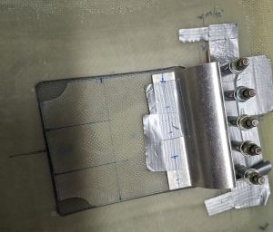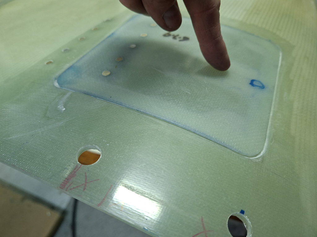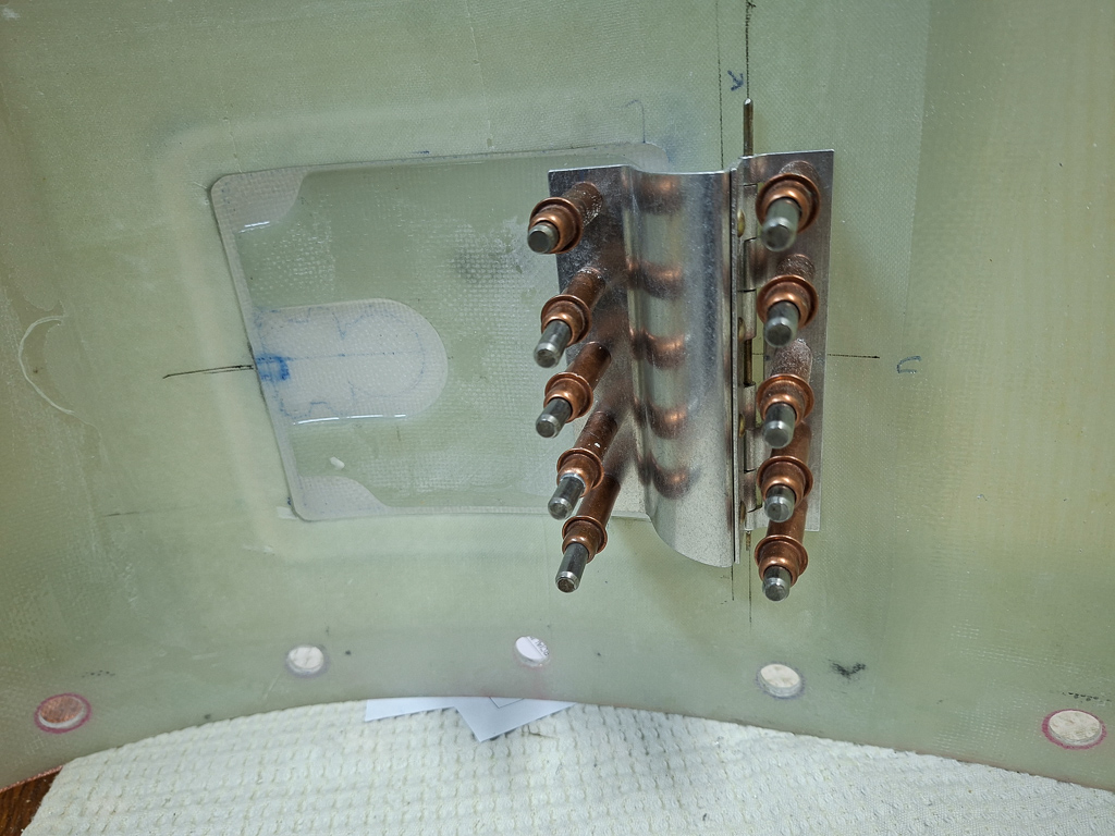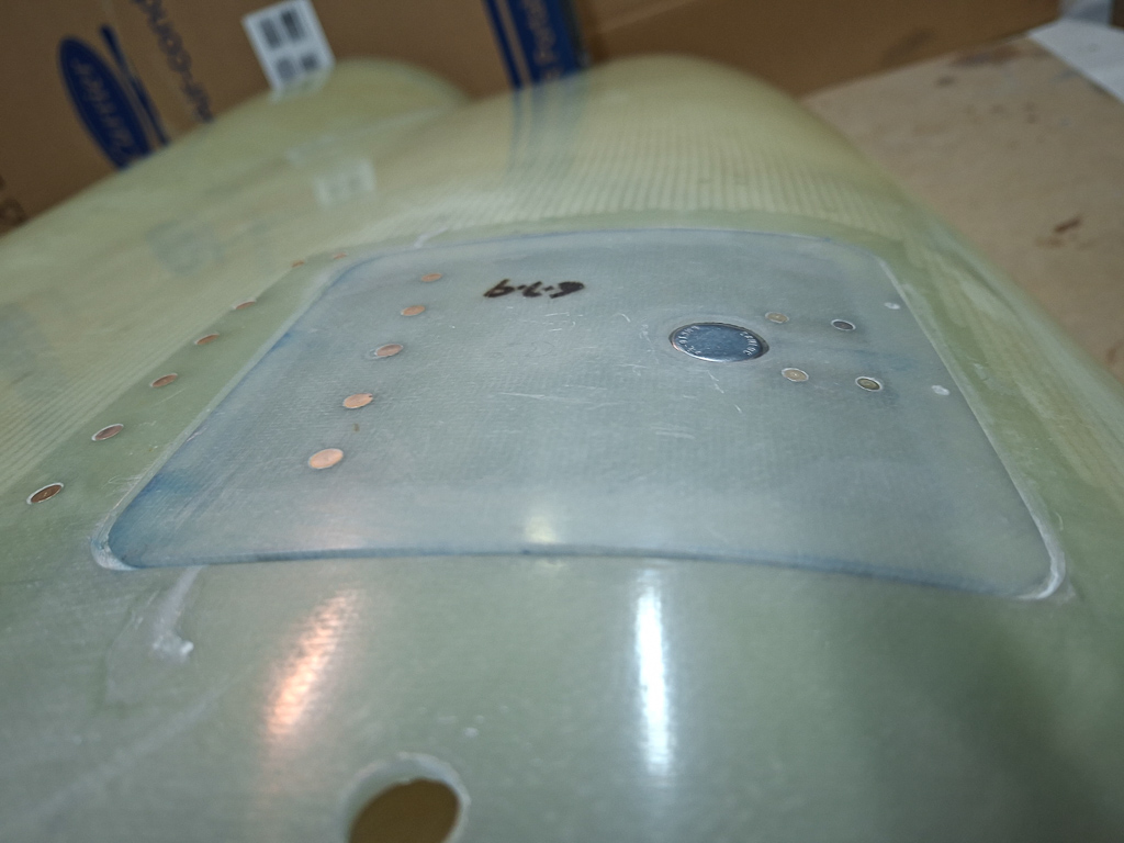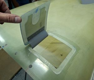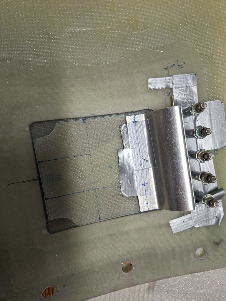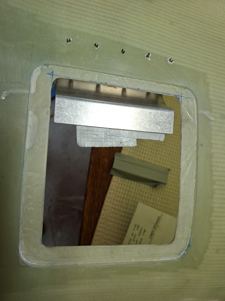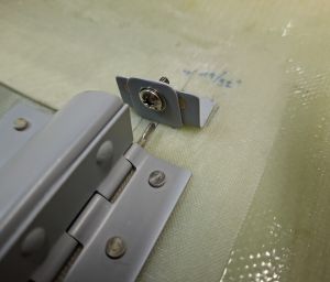 In the next image, I had already cut out te doubler from some stock epoxy and positioned it on the door and underneath the hinge flange. Marked the position of the rivets and drilled the hinge on the door, carefully watching the position of the door in the top cowl.