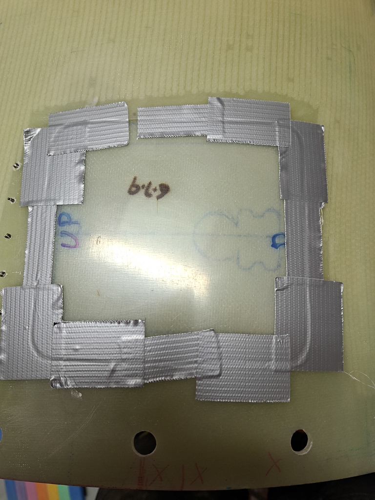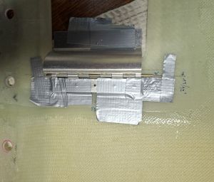 Install the hinge so that the curved part of the hinge just misses the cowling when opening. It's best to remove the spring to make it easier to see the range of motion during mounting. Mount the hinge to the cowling first, then mount the oil door to the hinge. Duct tape is your best friend to keep things in place and test motion before you start drilling. I also taped the door itself to the hinge. I will reinforce the door with a double layer of epoxy so I also taped a temporary spacer on the door.