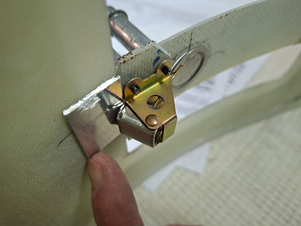 Here I positioned the test piece in place, held the 0.063 aluminum strip in place and checked the locking thightness in relation to the strip on the top cowl. I had 2 extra pieces of epoxy glued under the door.