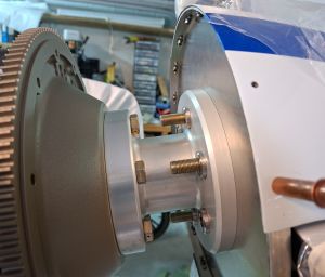 Short bolts hang the spool to the prop hub behind the starter flywheel. You bolt these in in a star pattern. I am just doing this temporarily so there is no torqueing involved yet. This will come of a zillion of times. The long bolts holding the propellor and everything forward of the spool extentions are very long. The threads also extend quite far through the extension. This is probably for having enough space if an additional weight plate has to be added up front.