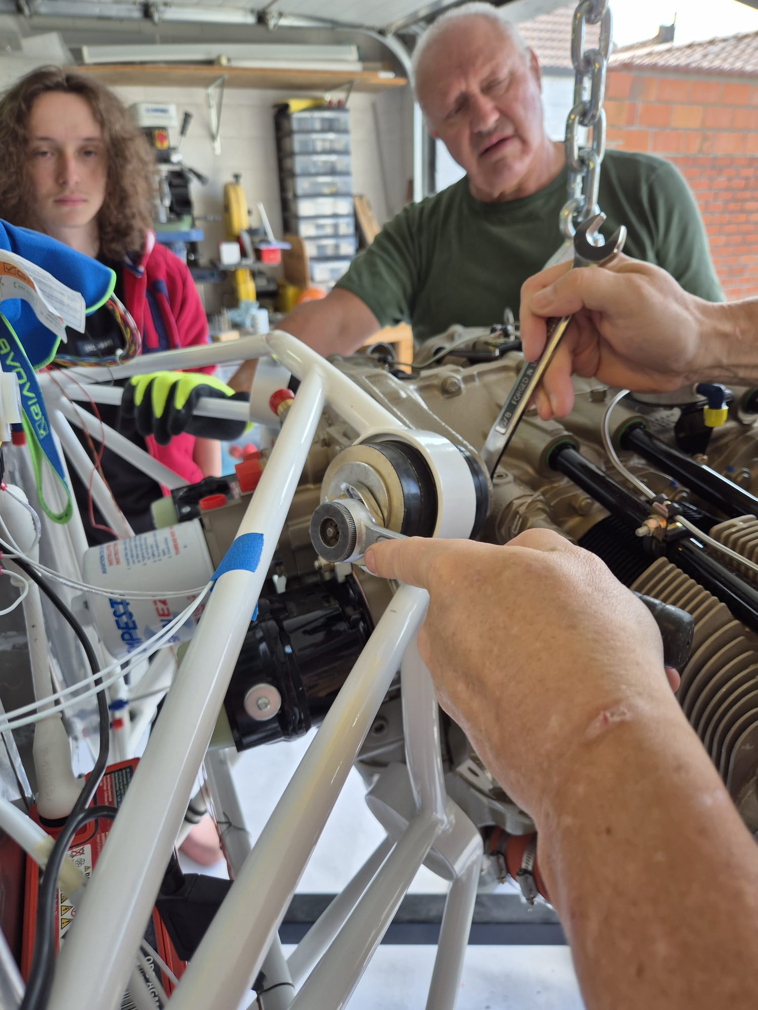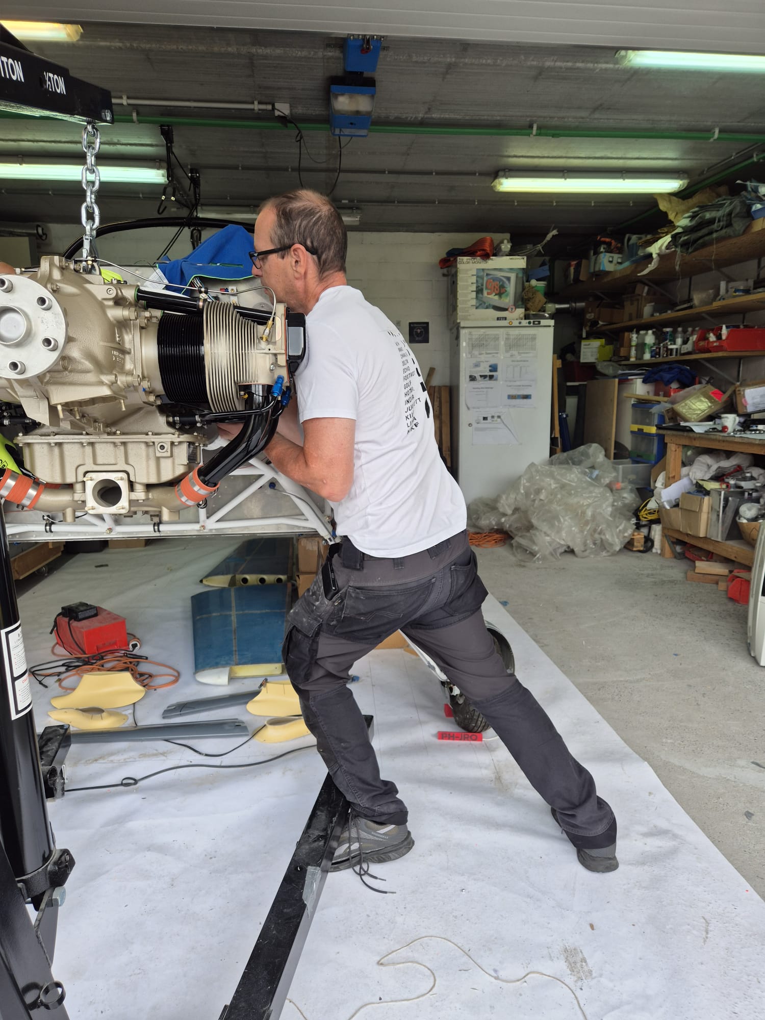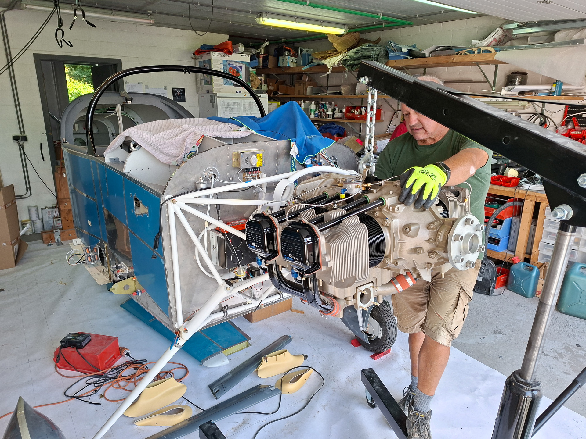 The last part of the moving is the most critical as you don't want your magneto's or fuel pump to bump into the engine mount. Having one person moving and another one guiding the engine is no luxury.