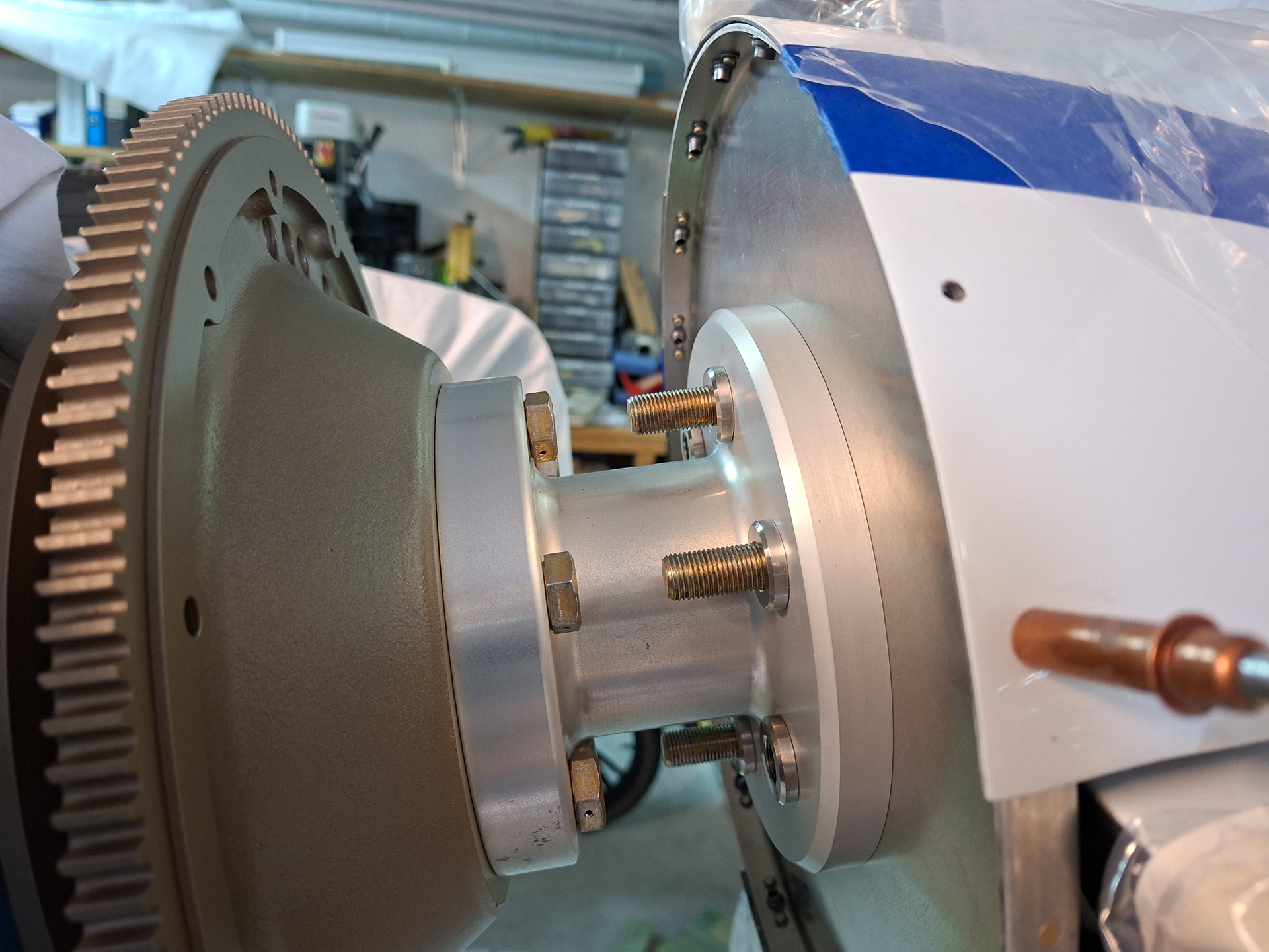 Short bolts hang the spool to the prop hub behind the starter flywheel. You bolt these in in a star pattern. I am just doing this temporarily so there is no torqueing involved yet. This will come of a zillion of times. The long bolts holding the propellor and everything forward of the spool extentions are very long. The threads also extend quite far through the extension. This is probably for having enough space if an additional weight plate has to be added up front.