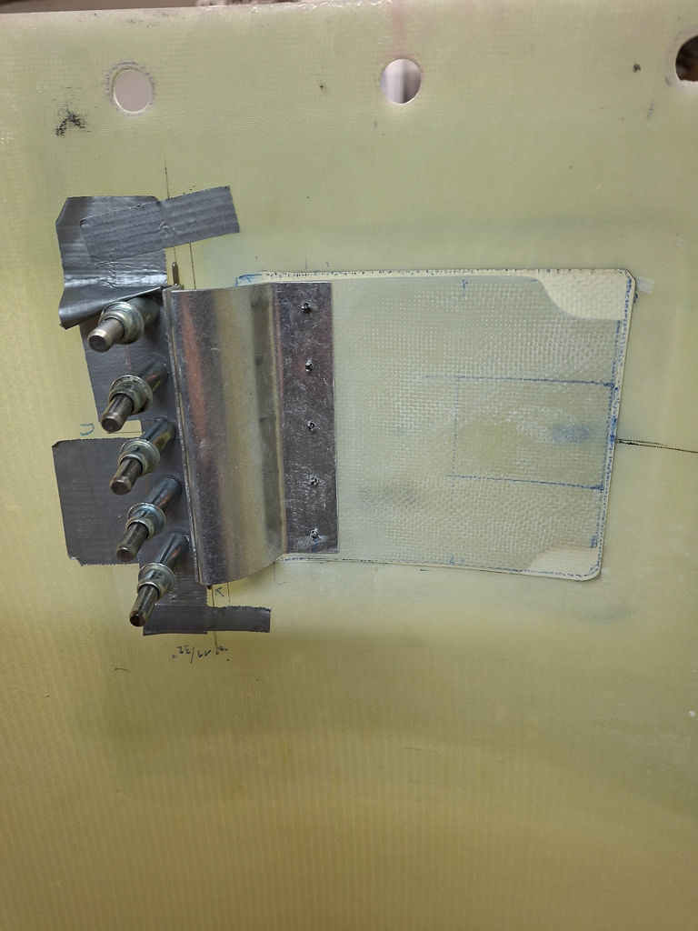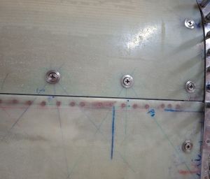 Next shot has the door drilled to the hinge flange through the epoxy doubler. Finally today, I will epoxy the doubler to the door by roughning the surface with 80grit sandpaper and making some epoxy paste as glue.