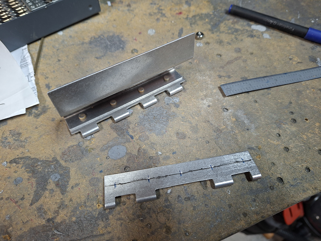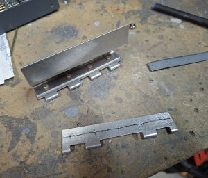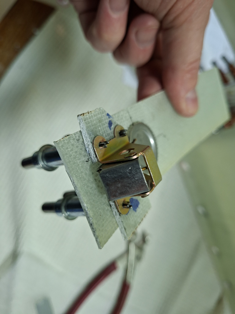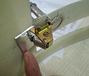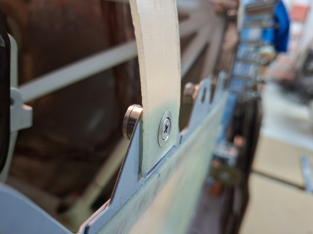 Here I positioned the test piece in place, held the 0.063 aluminum strip in place and checked the locking thightness in relation to the strip on the top cowl. I had 2 extra pieces of epoxy glued under the door.