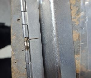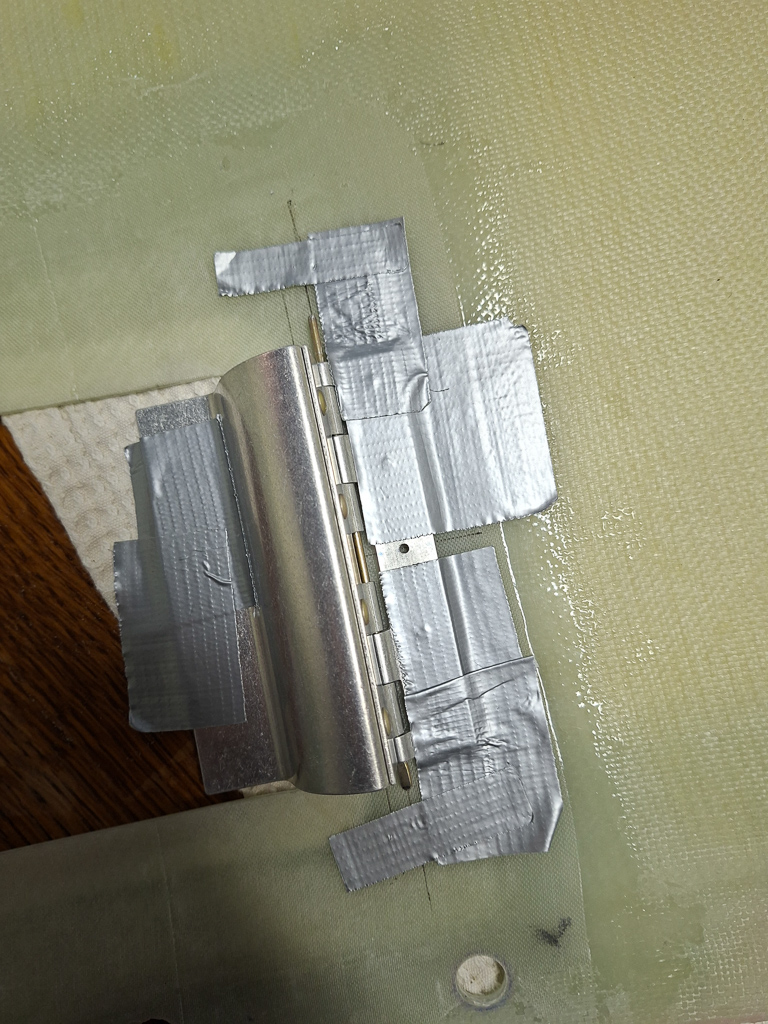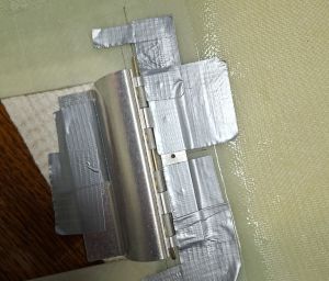 Install the hinge so that the curved part of the hinge just misses the cowling when opening. It's best to remove the spring to make it easier to see the range of motion during mounting. Mount the hinge to the cowling first, then mount the oil door to the hinge. Duct tape is your best friend to keep things in place and test motion before you start drilling. I also taped the door itself to the hinge. I will reinforce the door with a double layer of epoxy so I also taped a temporary spacer on the door.