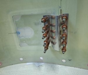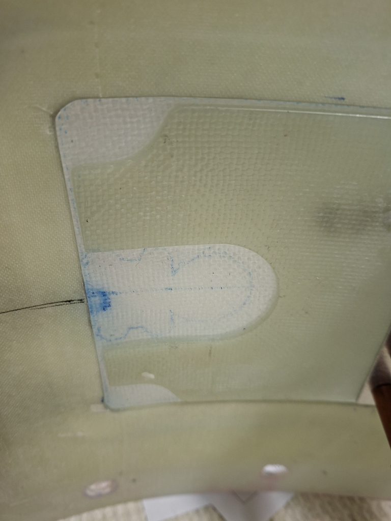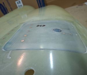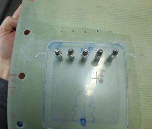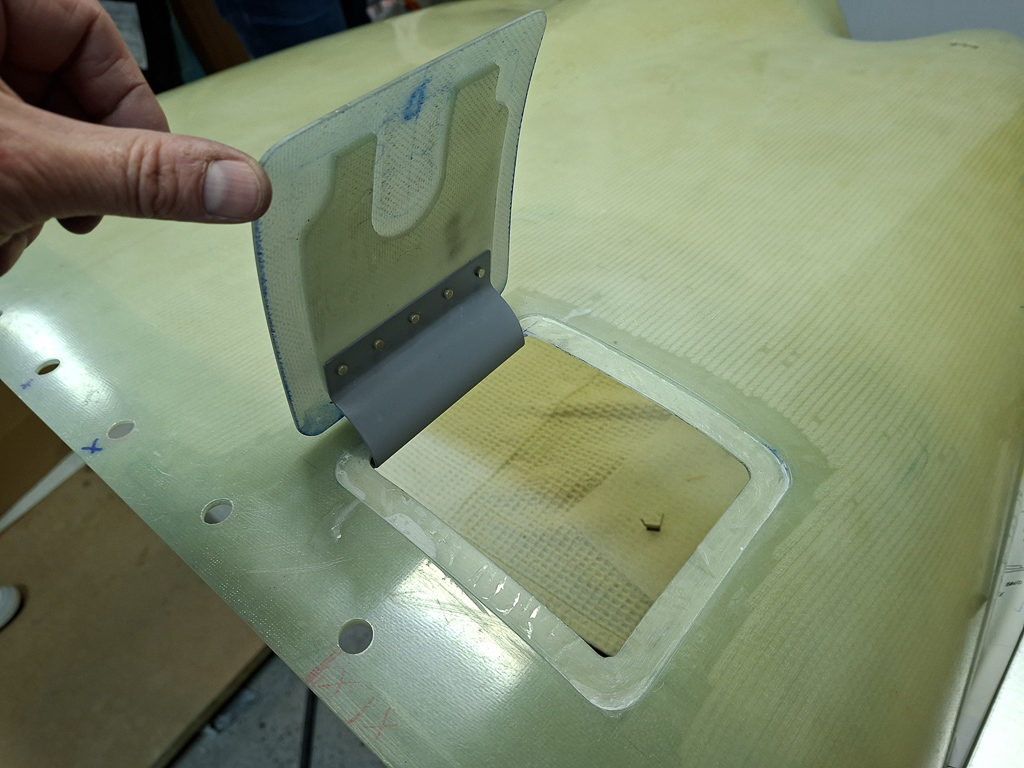 In the next image, I had already cut out te doubler from some stock epoxy and positioned it on the door and underneath the hinge flange. Marked the position of the rivets and drilled the hinge on the door, carefully watching the position of the door in the top cowl.