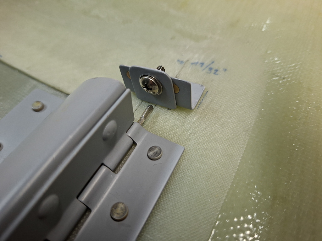 With the door nicely positioned in the extrusion, I drilled the holes in the hinge pin and through the top cowling. First #40, then updrilled #30.