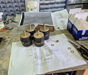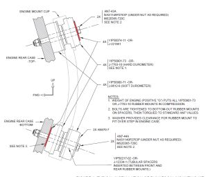 Study the plans carefully, the barry mounts have to be positioned so that the engine rests on the compression side in the bottom and the compression side in the back on the top mounts. The compression barry mounts are the ones that have a step in the rubber. The non compression ones don't have the ribble on it and look like plain rubber. If I remember well, the non compression ones also are a little larger. Also take care that the washers are in the correct locations. The barry mounts come with one big washer in the box. It's good to assemble the order of all this before starting to move the engine and have thing prepared well. I colored the position of the large washer red in the picture above.
