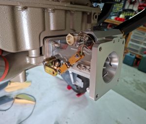 The orientation of the throttle body was a bit of a mystery at first but soon figured out what side was the throttle lever and which side the mixture. In the image below I installed it on the forward horizontal induction air intake at the cold sump of the engine. In the image below, the throttle lever is the gold colored arm.